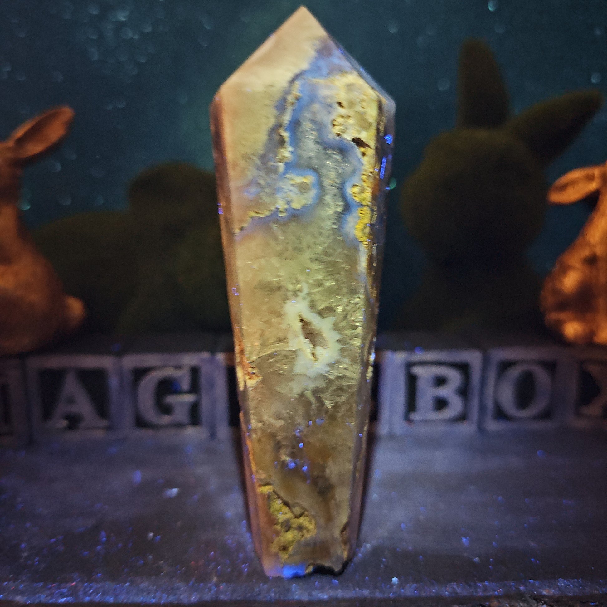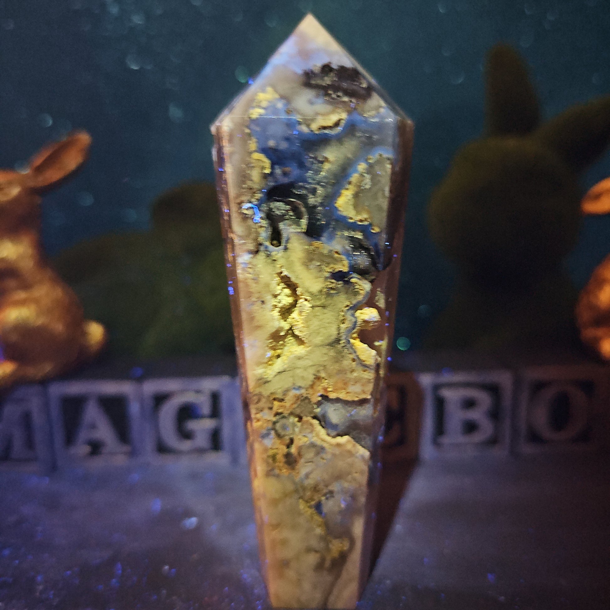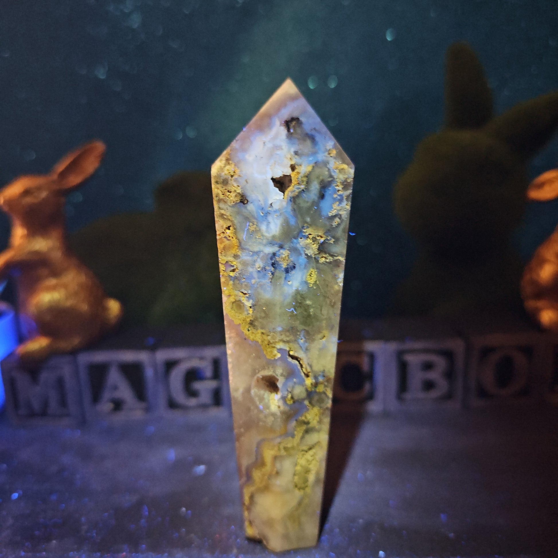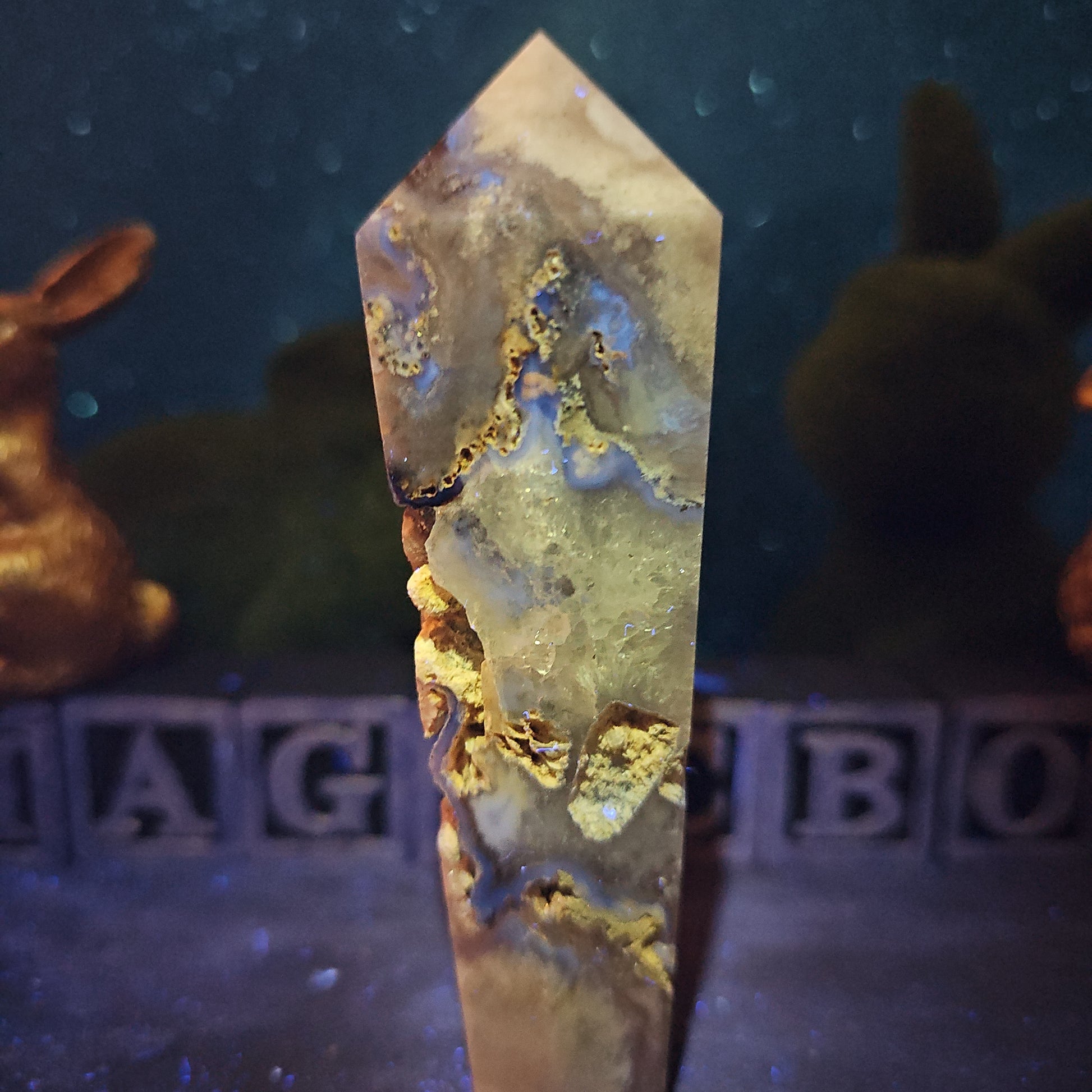 Unearth the captivating beauty of our Volcanic Flower Agate Wand Freeform. Handcrafted from the finest volcanic flower agate, this mesmerizing specimen showcases the intricate patterns and vibrant colors that make flower agate a beloved choice for crystal enthusiasts.