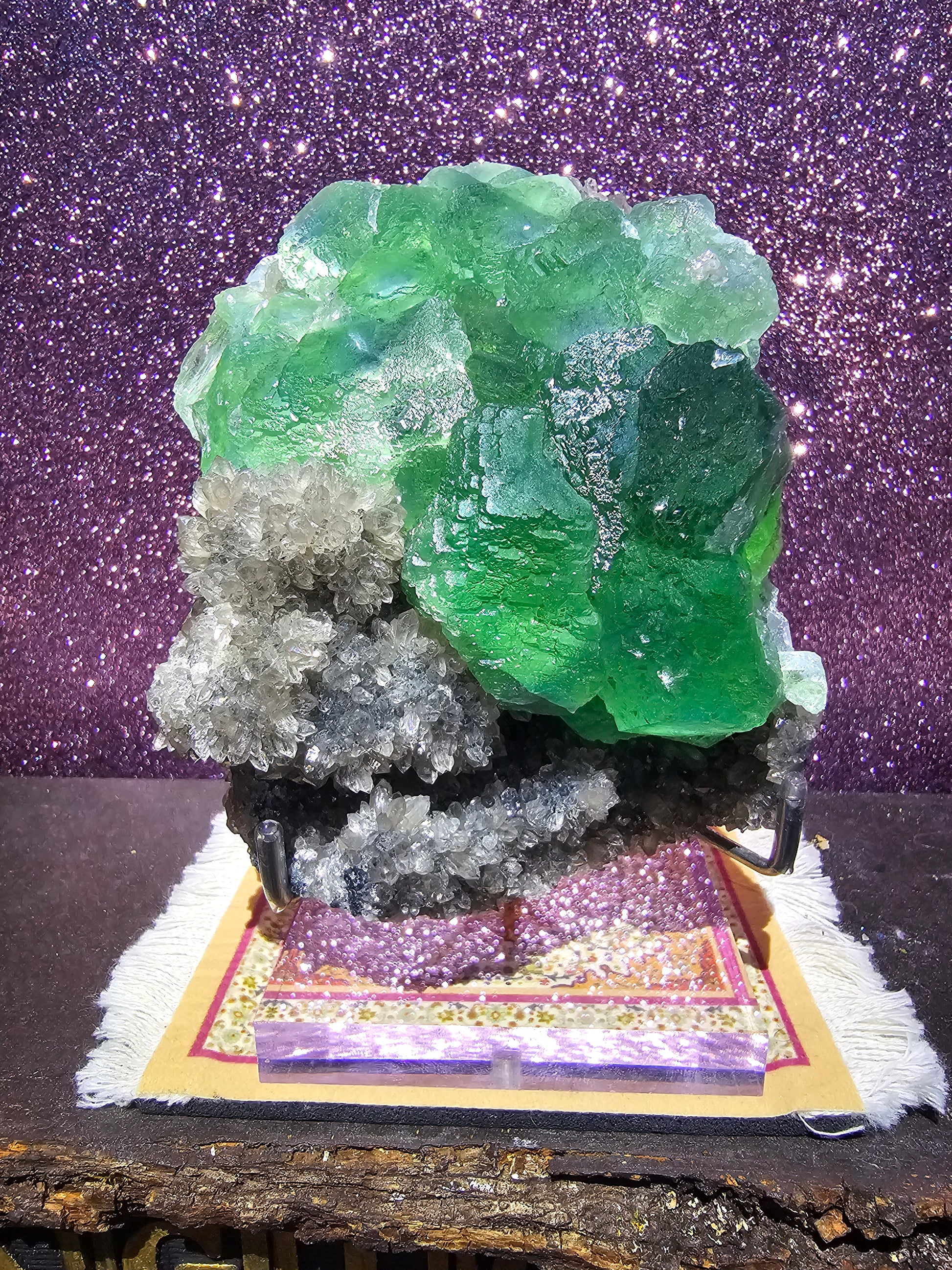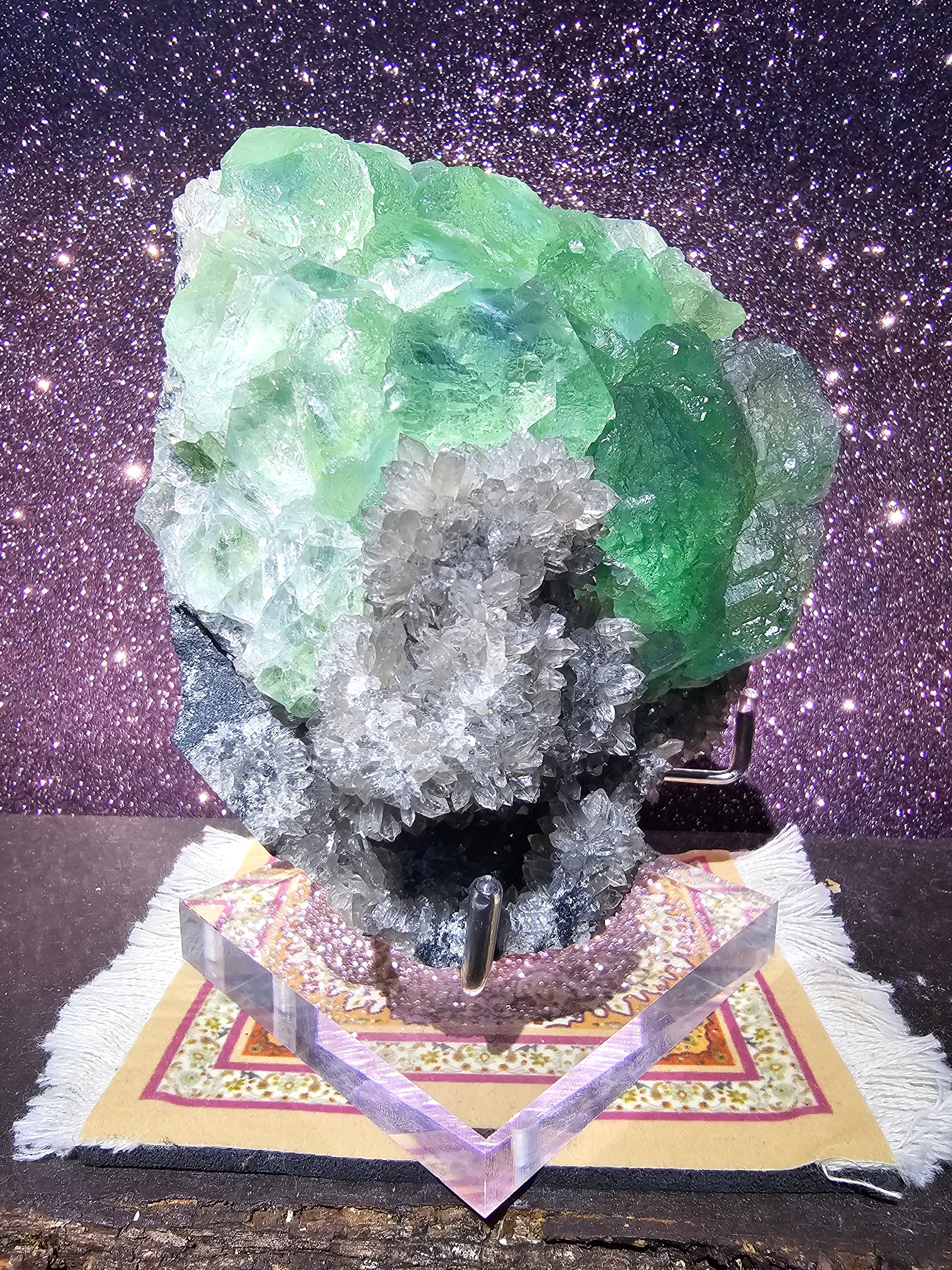Introducing our Yaogangxian Fluorite, a stunning masterpiece of Mother Nature's artistry. Sourced from the renowned Yaogangxian Mine, this fluorite specimen boasts an unparalleled beauty that captivates the senses. Its octahedral and cubic crystals, in striking shades of vibrant purple, deep green, and electric blue, form a mesmerizing kaleidoscope of color and geometry. With unparalleled clarity and translucency, it allows light to dance within, creating an awe-inspiring display of spectral brilliance. Whether displayed as a collector's gem, used for metaphysical practices, or simply admired for its breathtaking aesthetics, the Yaogangxian Fluorite elevates any space with its harmonious blend of color, clarity, and natural wonder. Invite the soothing and transformative energies of fluorite into your life and adorn your surroundings with this exquisite masterpiece, a testament to the Earth's unparalleled artistry. Illuminate your environment with the enchanting allure of this unique gem, an embodiment of both earthly and spiritual beauty.