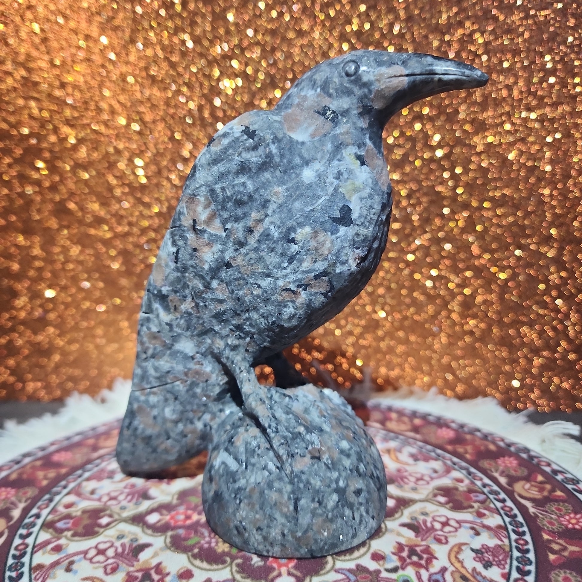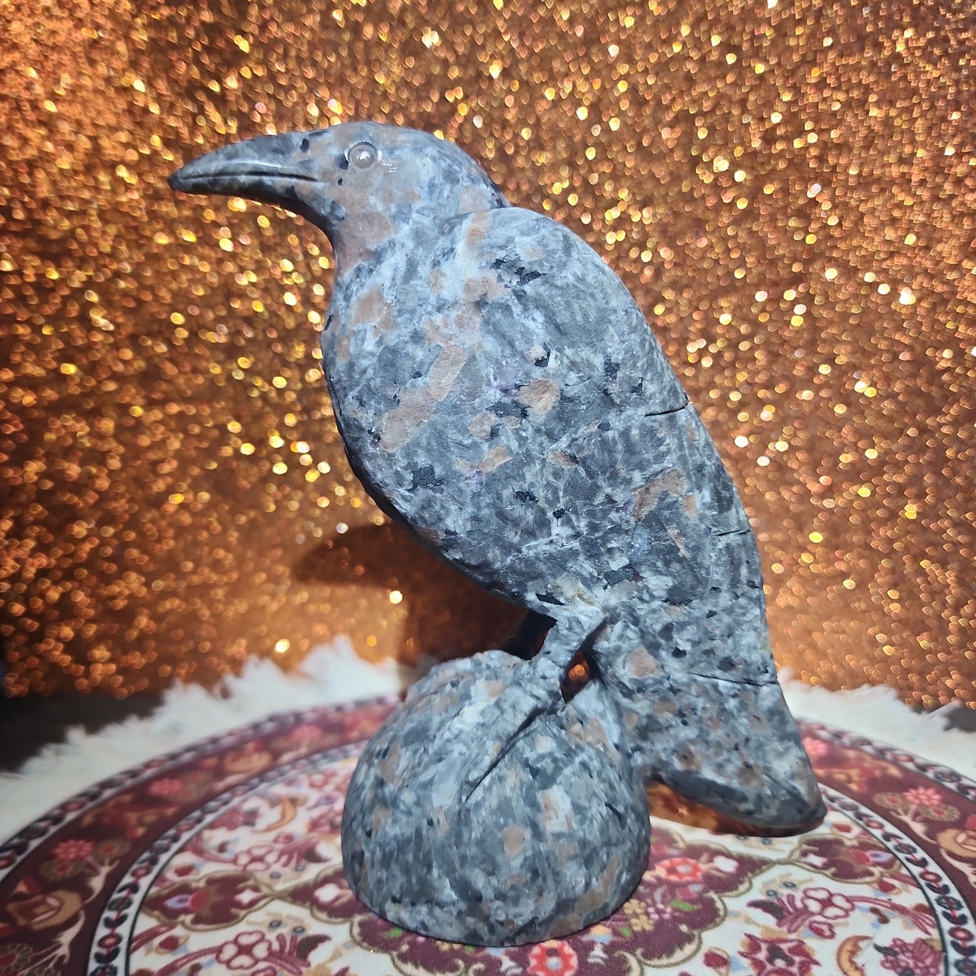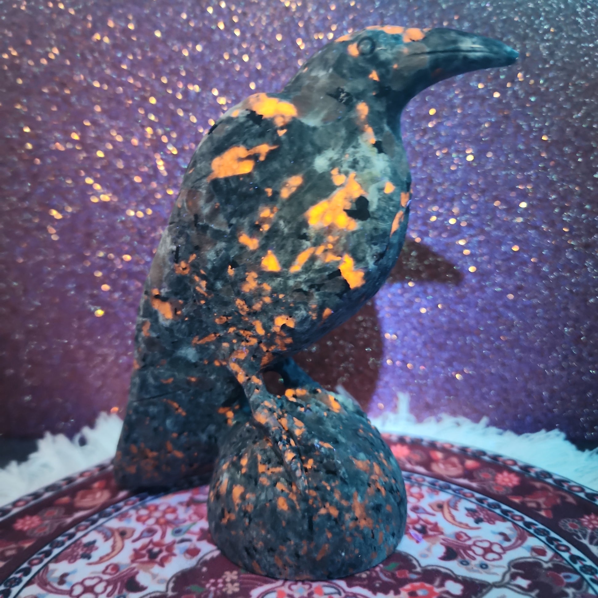 Introducing the Yooperlite Crow Carving, a captivating work of art that merges nature's beauty with artistic craftsmanship. This unique creation showcases a lifelike crow sculpture carved from high-quality Yooperlite, a rare fluorescent rock found exclusively in Michigan's Upper Peninsula. Illuminated under UV light, this magnificent crow carving radiates an otherworldly glow, revealing the hidden patterns and colors within the Yooperlite stone.