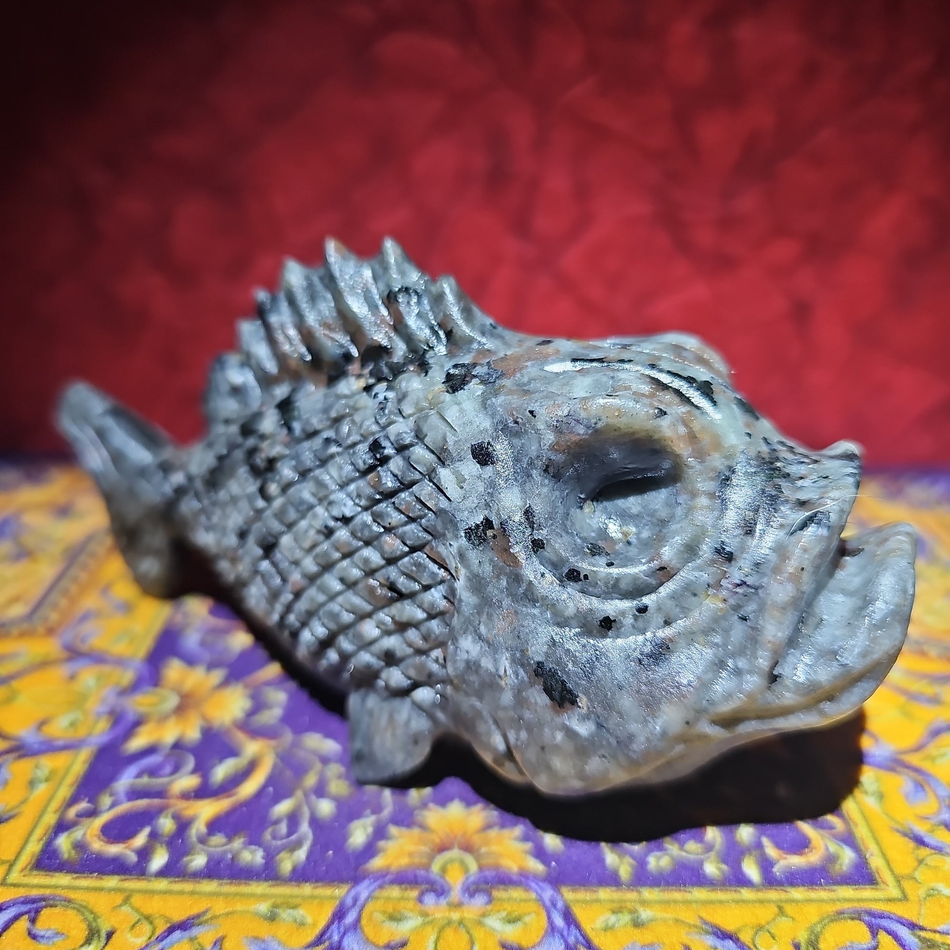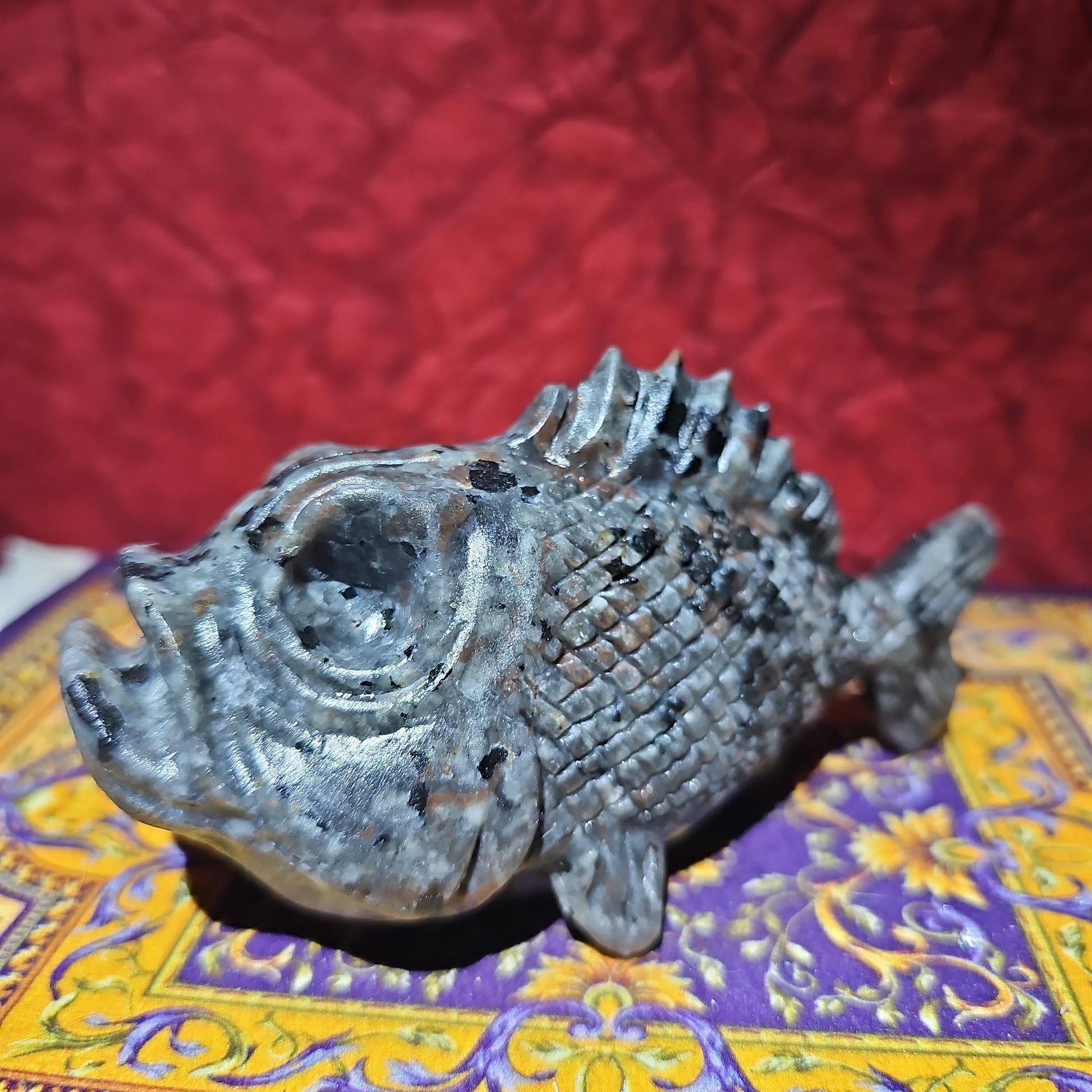Yooperlite, known for its distinctive fluorescent properties, takes on a whimsical and fantastical form in the shape of a vampire cat. This fusion creates a visually stunning and playfully mysterious display, bringing a touch of the mystical into your collection.