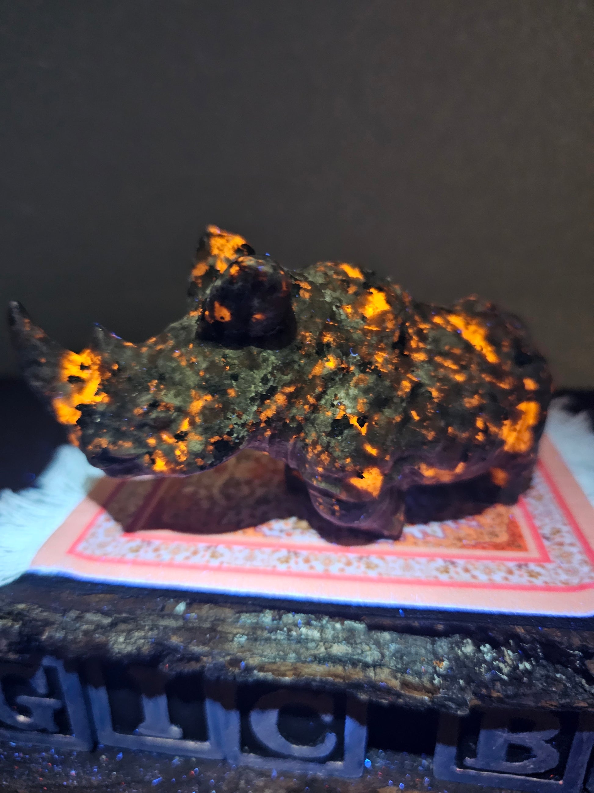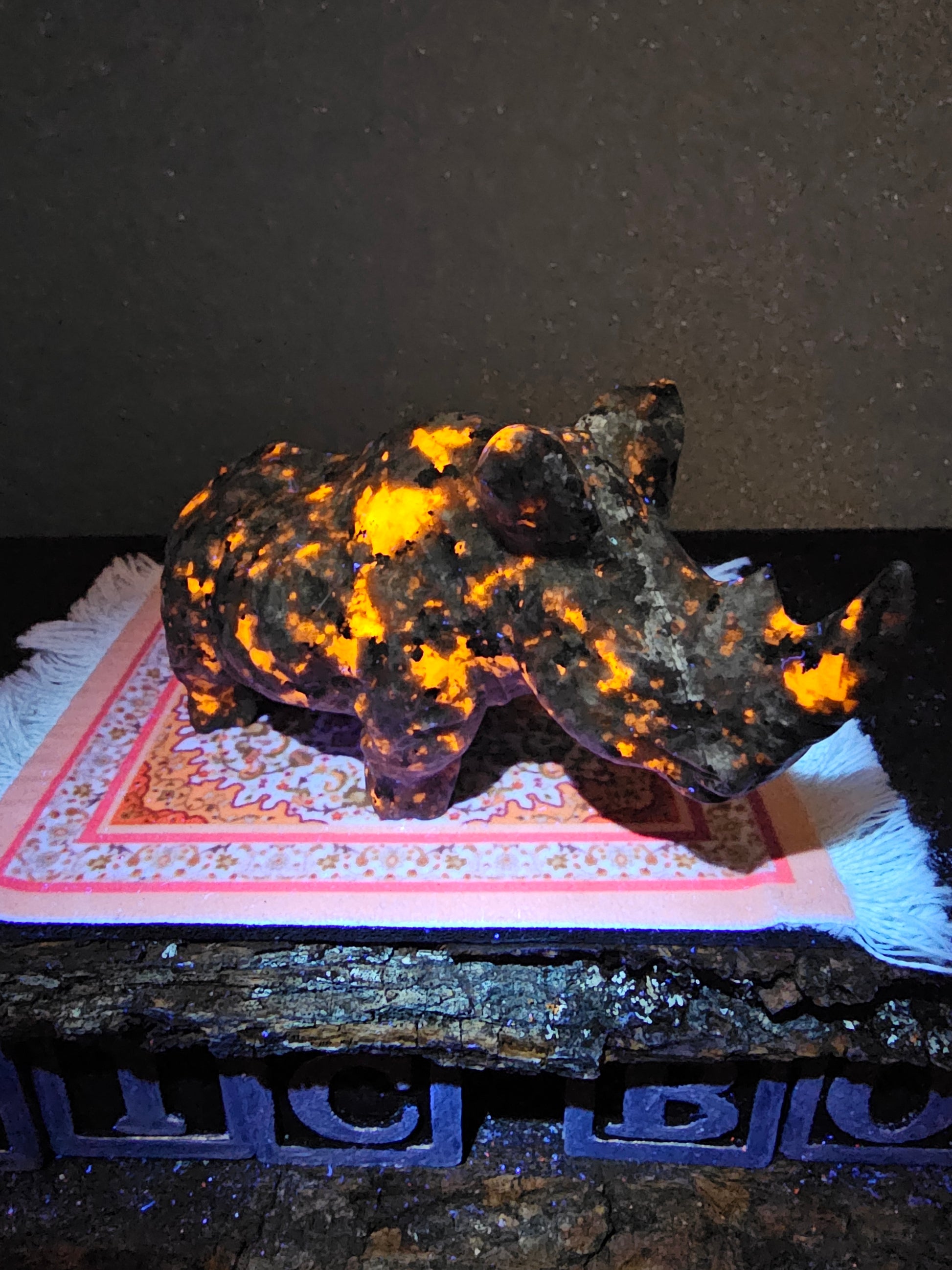 Each rhino is meticulously carved to showcase the natural beauty and luminescence of Yooperlite. Under UV light, this piece reveals a mesmerizing glow, adding an enchanting element to your collection.