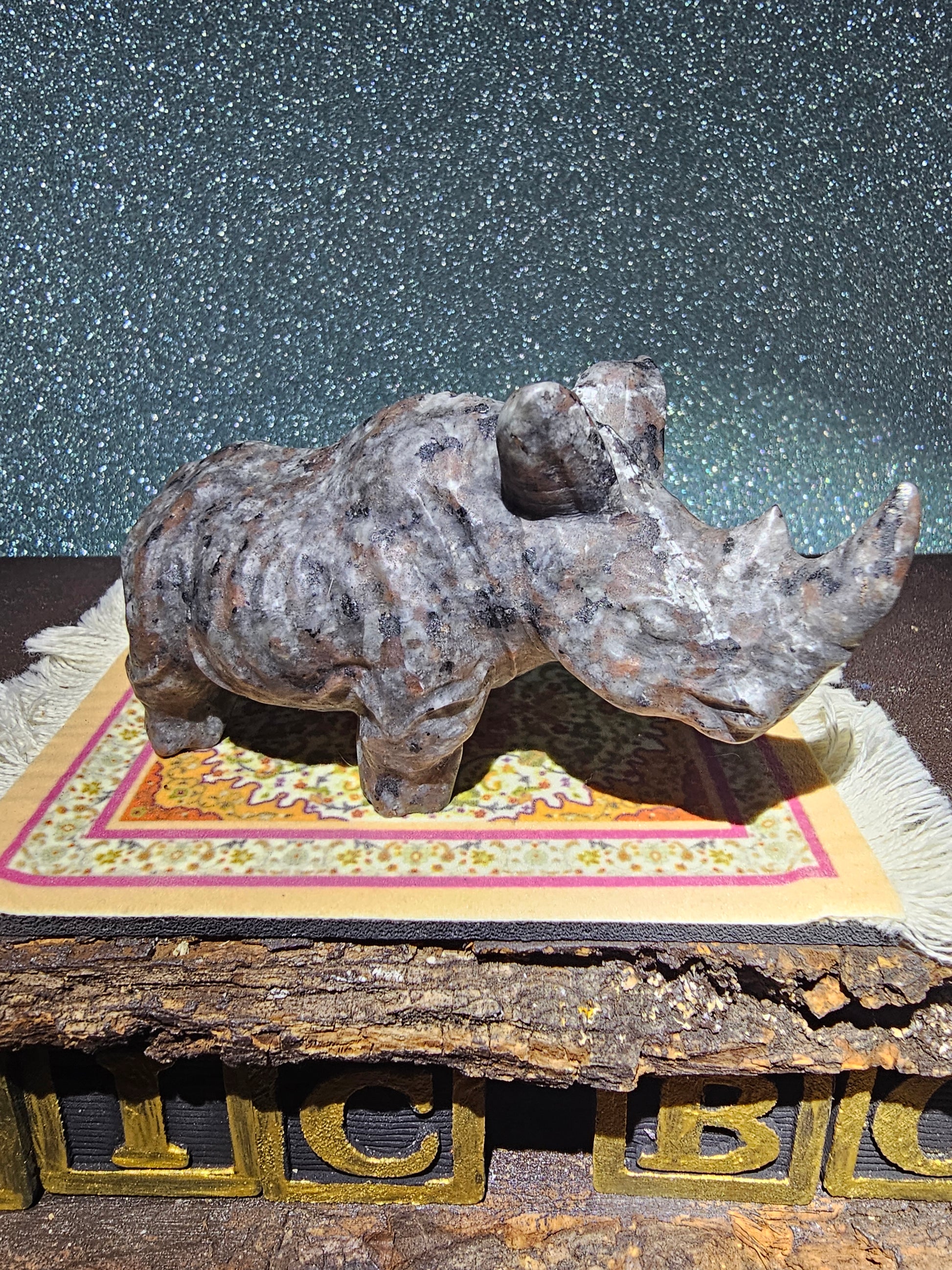 Step into a world of mystical beauty with our Yooperlite Rhino. Crafted from the unique and luminous Yooperlite, this captivating sculpture embodies strength and resilience with a touch of magical glow.