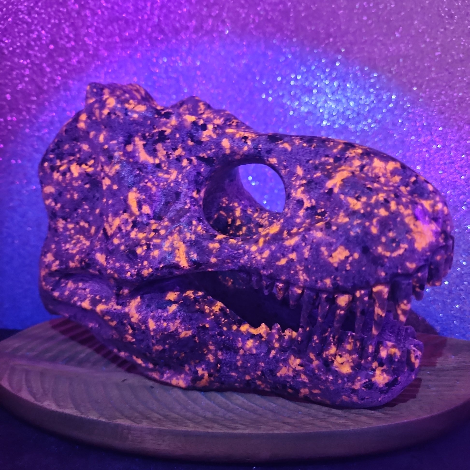 Yooperlite, a rare variety of fluorescent sodalite found only in Michigan's Upper Peninsula, possesses a magical quality that comes to life when exposed to UV light. The T-Rex Skull crafted from this captivating mineral creates a mesmerizing spectacle, as if the long-extinct dinosaur has been brought back to life, radiating a captivating glow in the darkness.